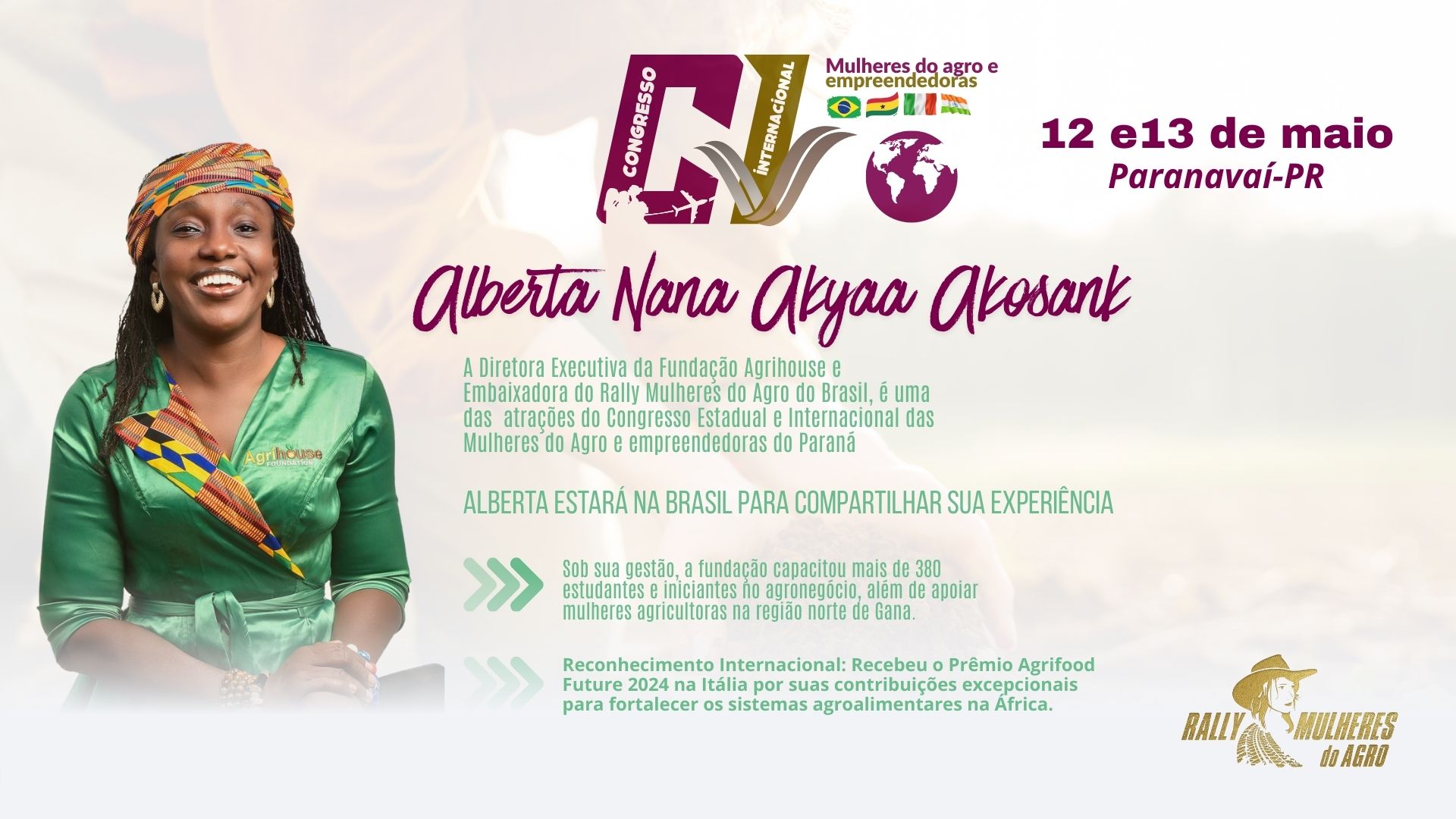 O Congresso Estadual e Internacional das Mulheres do Agro do Estado do Paraná, que acontecerá nos dias 12 e 13 de maio, no Centro de Eventos de Paranavaí vai contar com várias atrações, entre elas a presença da ganense Alberta Nana Akyaa Akosa, uma líder proeminente no setor agrícola de Gana, reconhecida como fundadora e diretora executiva da Agrihouse Foundation, uma organização focada em transformação agrícola, capacitação de jovens e empoderamento de mulheres no agronegócio. A sua trajetória é marcada pela transição de um fundo em comunicação para se tornar uma defensora influente da agricultura no continente africano.