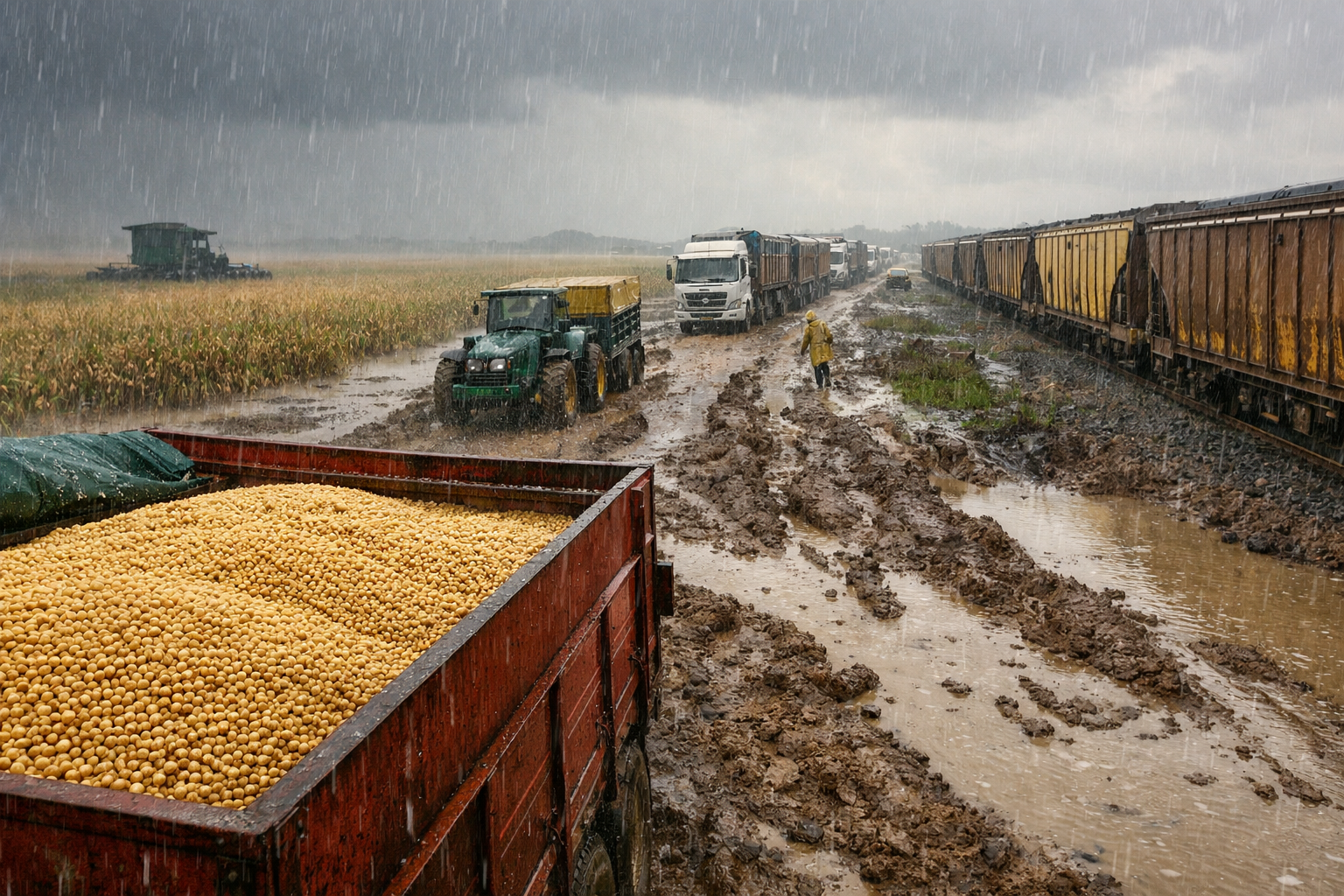 De acordo com os dados da plataforma, o volume de fretes de soja no Brasil registrou queda de 12,17% em fevereiro de 2026 na comparação com o mesmo mês do ano anterior. No Centro-Oeste, principal região produtora do país, a retração foi de 11,96% no mesmo período. O movimento, no entanto, não indica uma redução da produção, mas sim um atraso na dinâmica logística, causado pelas condições climáticas adversas.